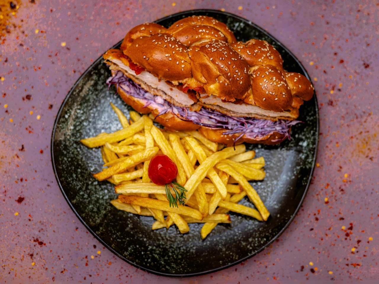 Challah with chicken schnitzel & fries – 300 g + 150 g